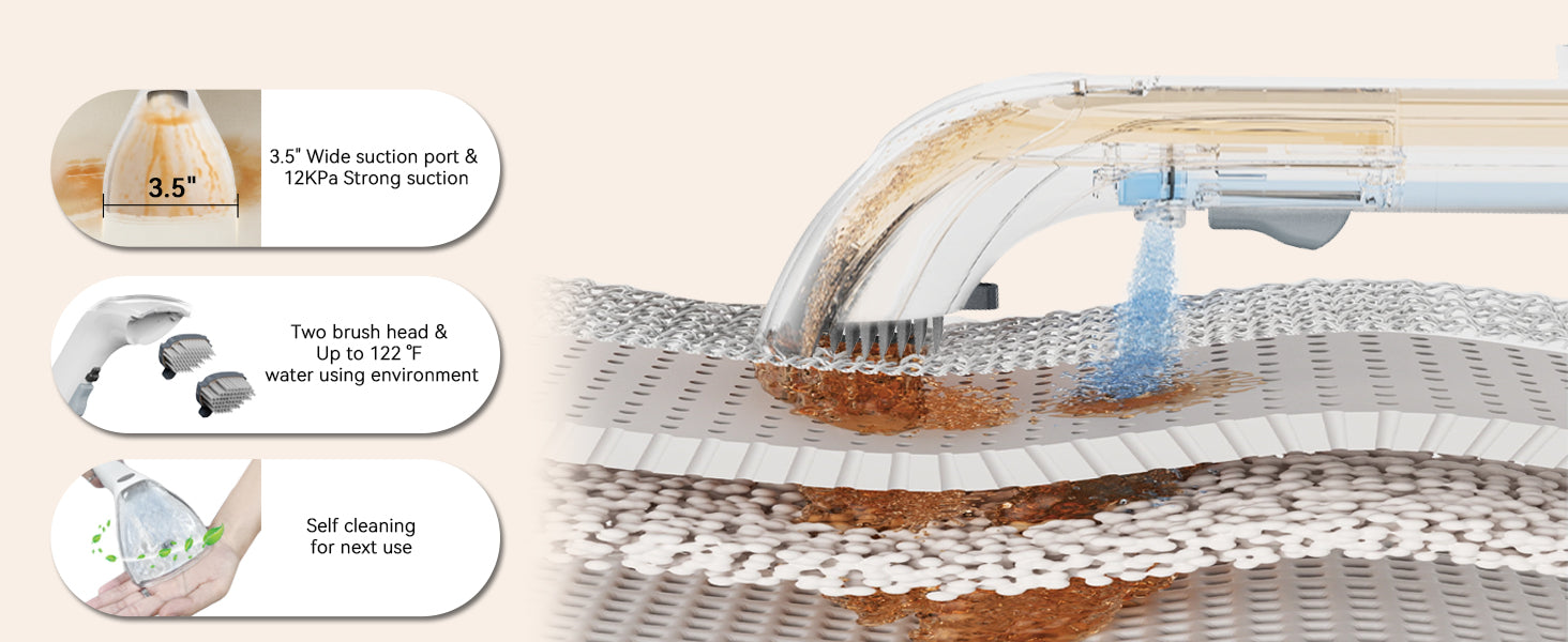 - Two interchangeable brush heads for effective removal of tough stains and gentle cleaning on delicate fabrics