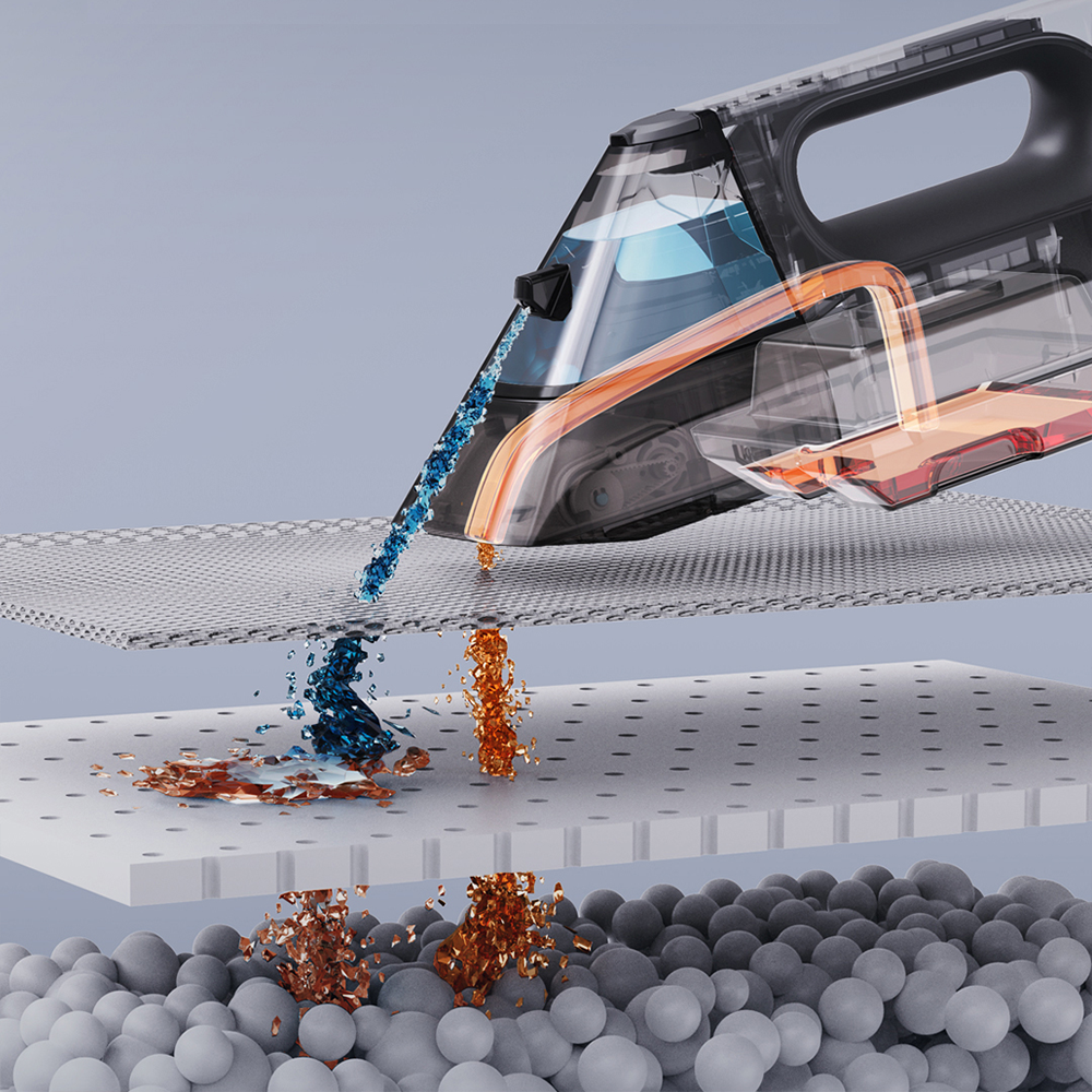 Next, spray onto the area you want to clean, and use the built-in brush to scrub away the dirt and stains. Finally, use the suction function to remove the dirty water and any remaining debris into the device's dirty water tank.