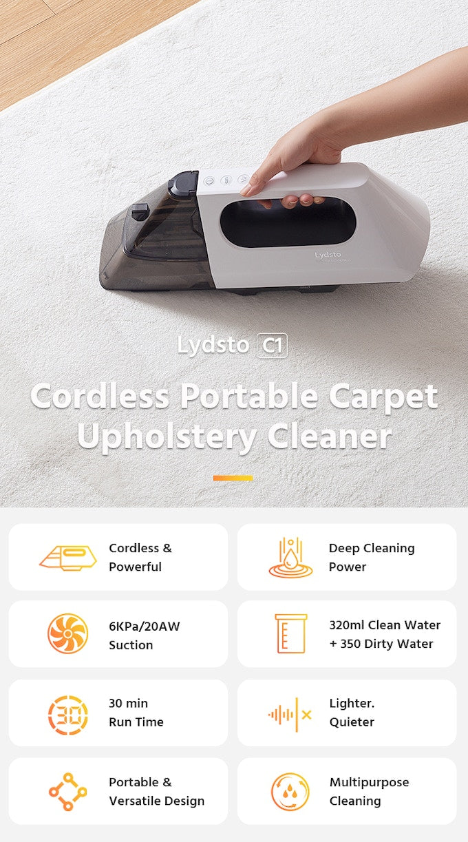 Leave power outlets and tripping hazards behind thanks to the cordless portable design. The built-in rechargeable 3x 2500mah battery provides up to30 minutesof continuous cleaning power. With6kpa (20aw)of max suction power, the Lydsto C1 effortlessly lifts dirt and stains fromcarpets, rugs, upholstery, stairs, and even car interiors.