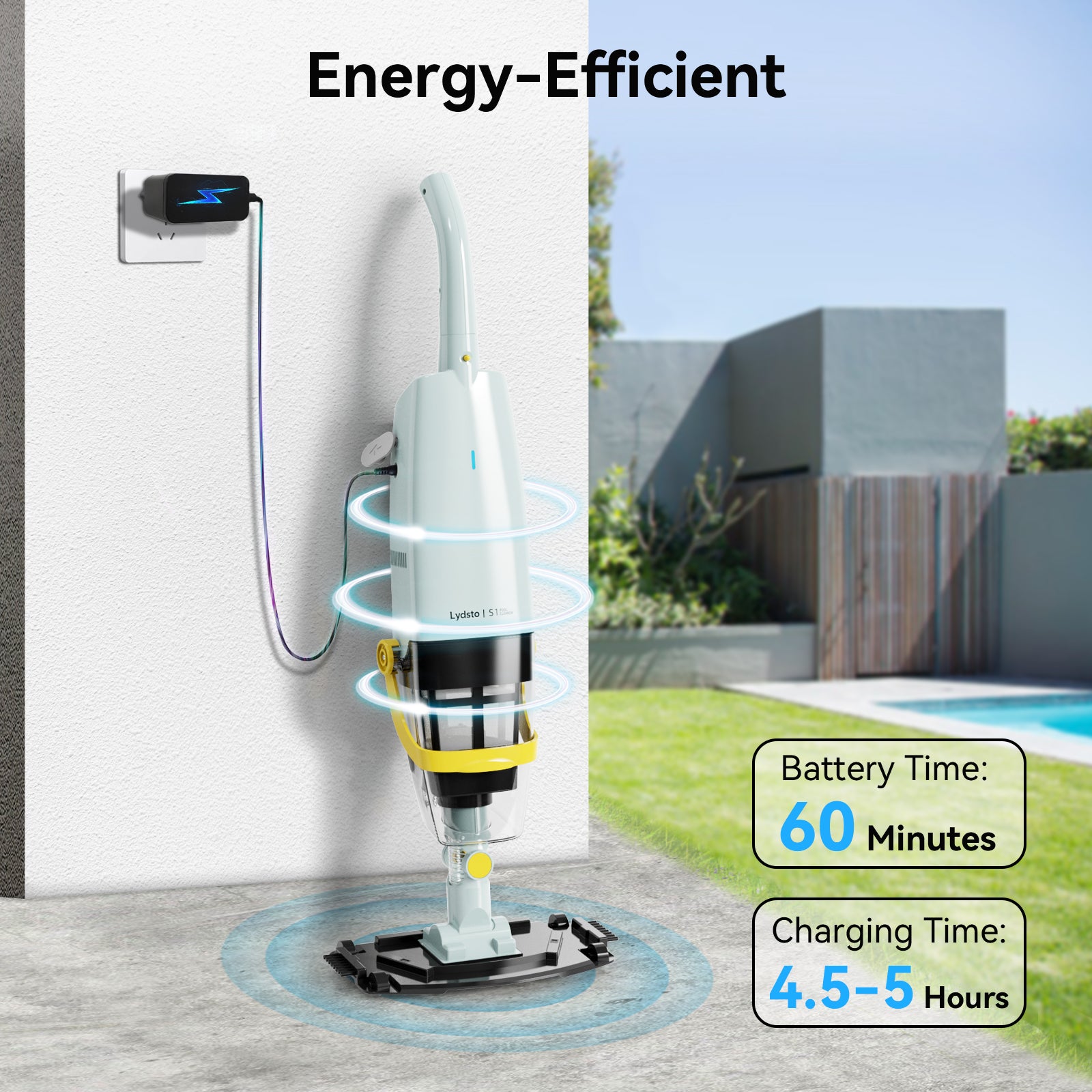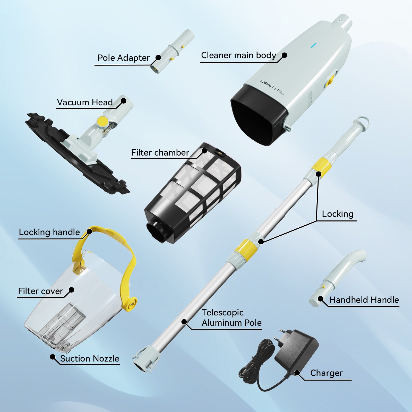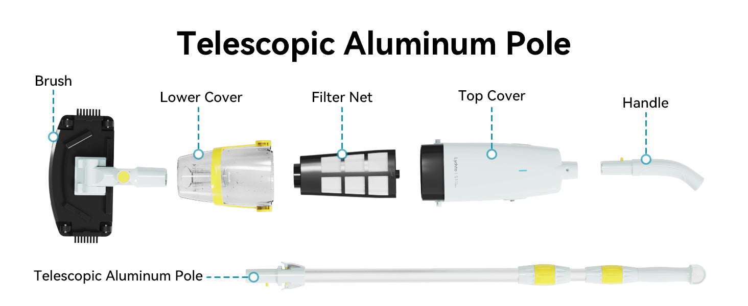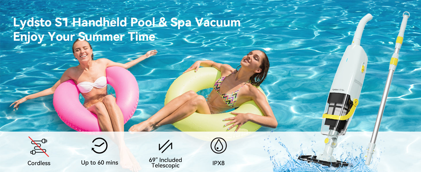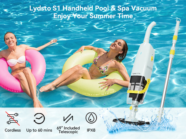Lydsto handheld pool vacuum S1, 69" telescopic pole, a charger, and a user manual.