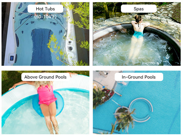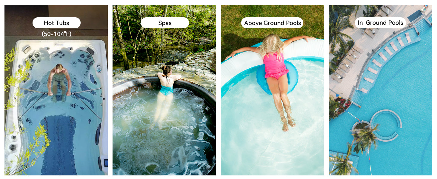 - Above-ground pools, small inground pools, spa, and hot tubs.
